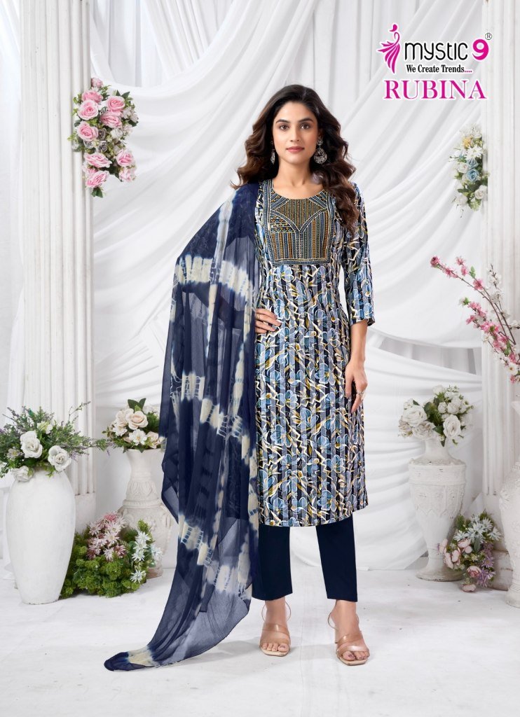 Mystic 9 Rubina Vol 10 Premium Rayon Dull Patta Kurti with Sleeve Lock Embroidery Straight Pant And Nazmeen Cotton Dupatta Wholesale