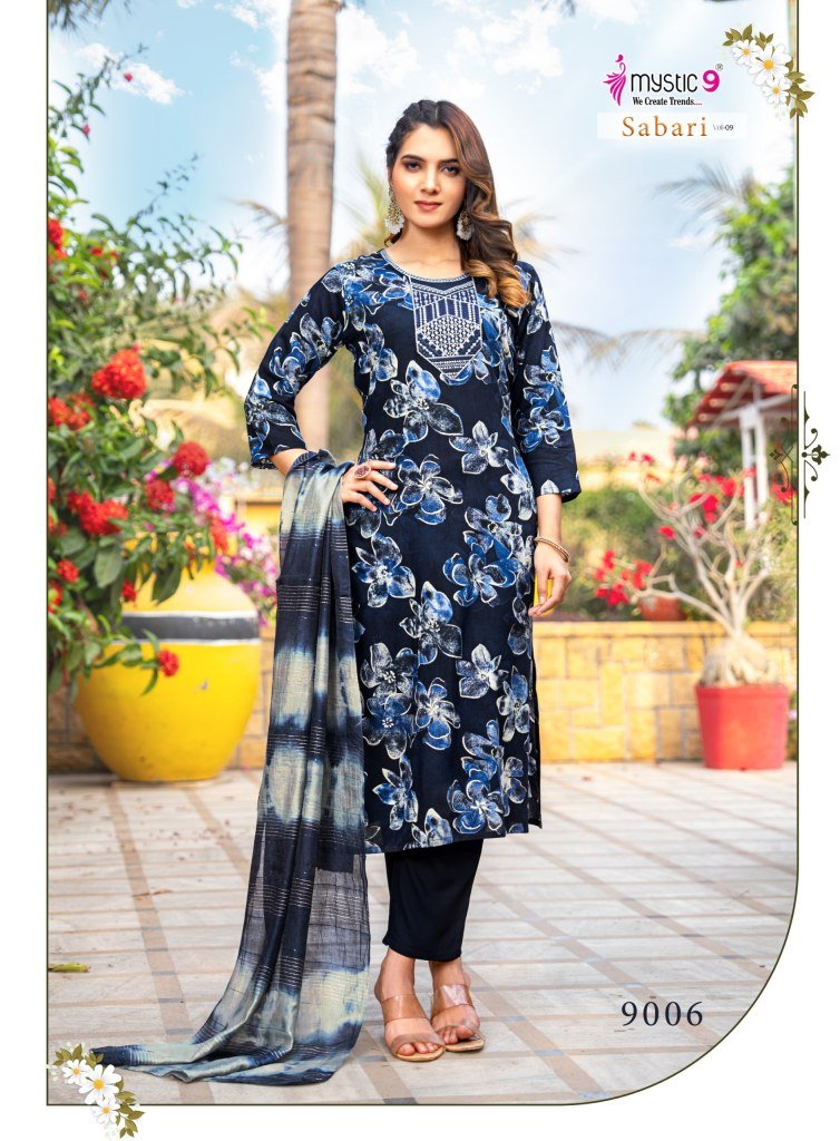 Mystic 9 Sabri Vol 9 Premium Rayon Foil Print Straight Suit Set with Embroidered Kurta Pant And Chanderi Dupatta Wholesale