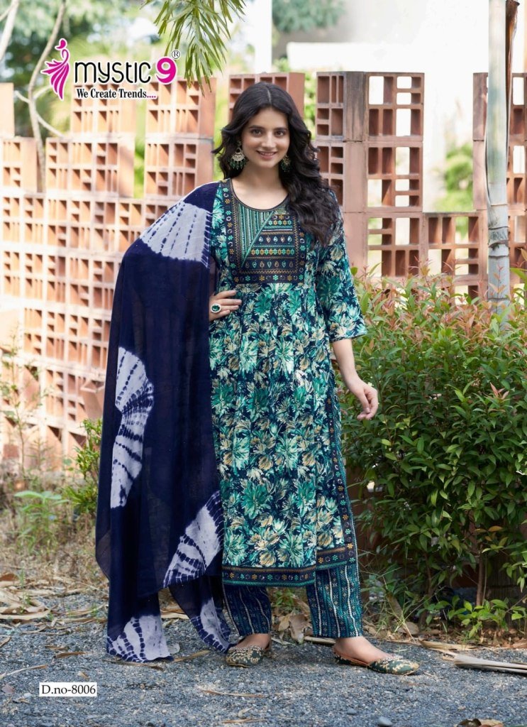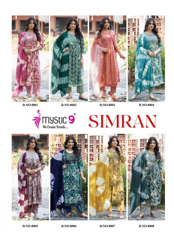 Mystic 9 Simran Vol 8 Premium Nayra Cut Rayon Suit with Exclusive Embroidery Work Pant And Chanderi Dupatta Wholesale