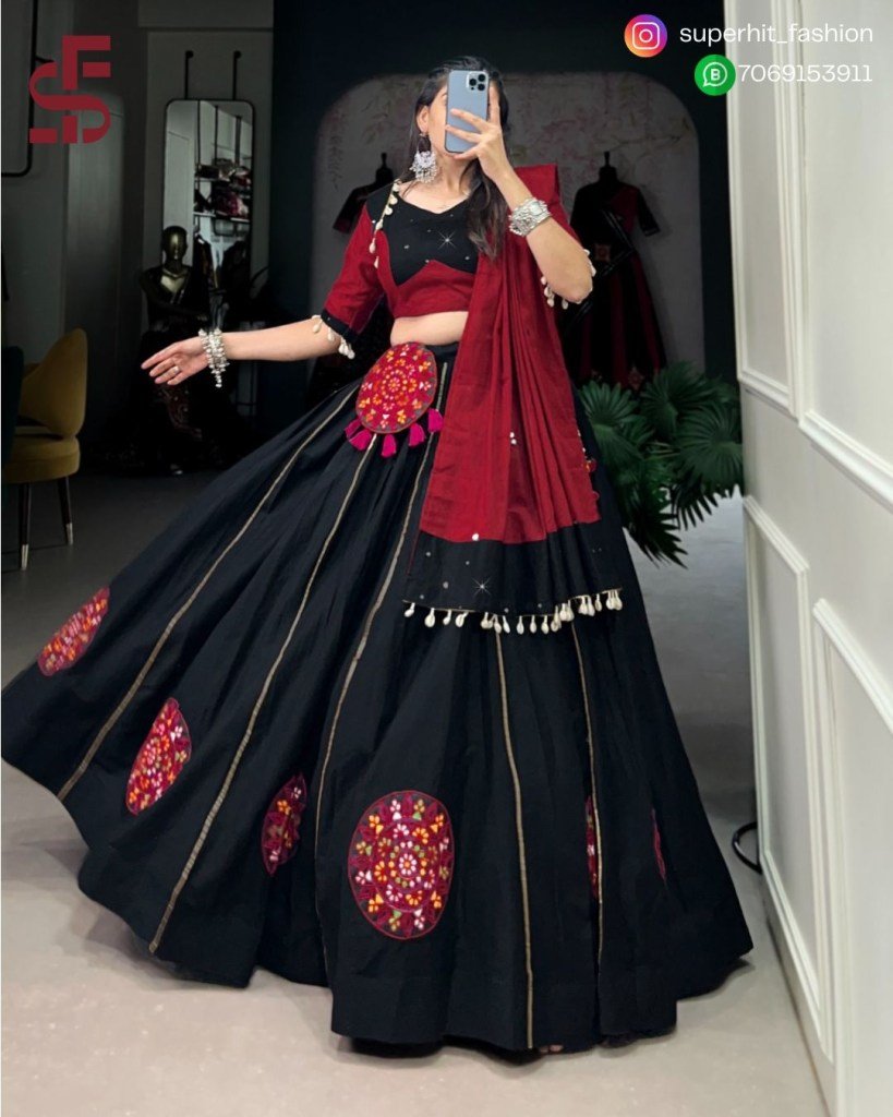 Navratri 1603 Ready Black Lehengha Choli Soft Cotton with Handworked Mirror And Gota Patti Fully Stitched Cotton with Handworked Mirror And Kabddi La