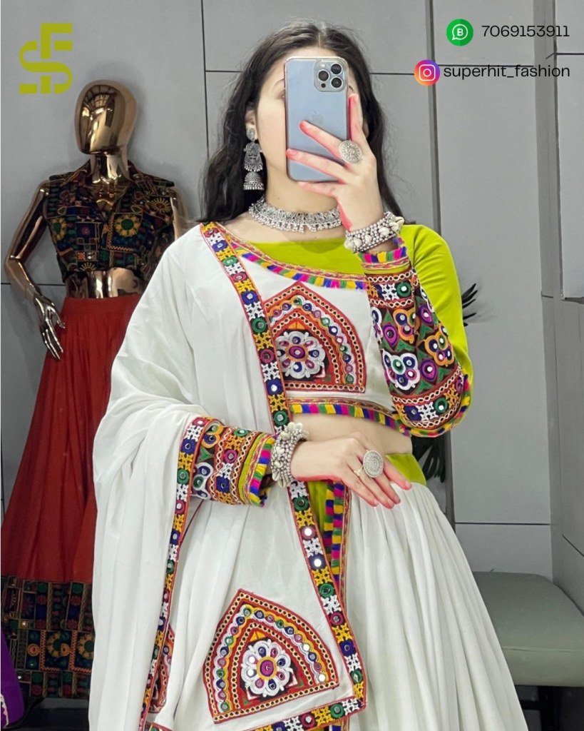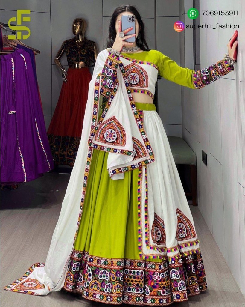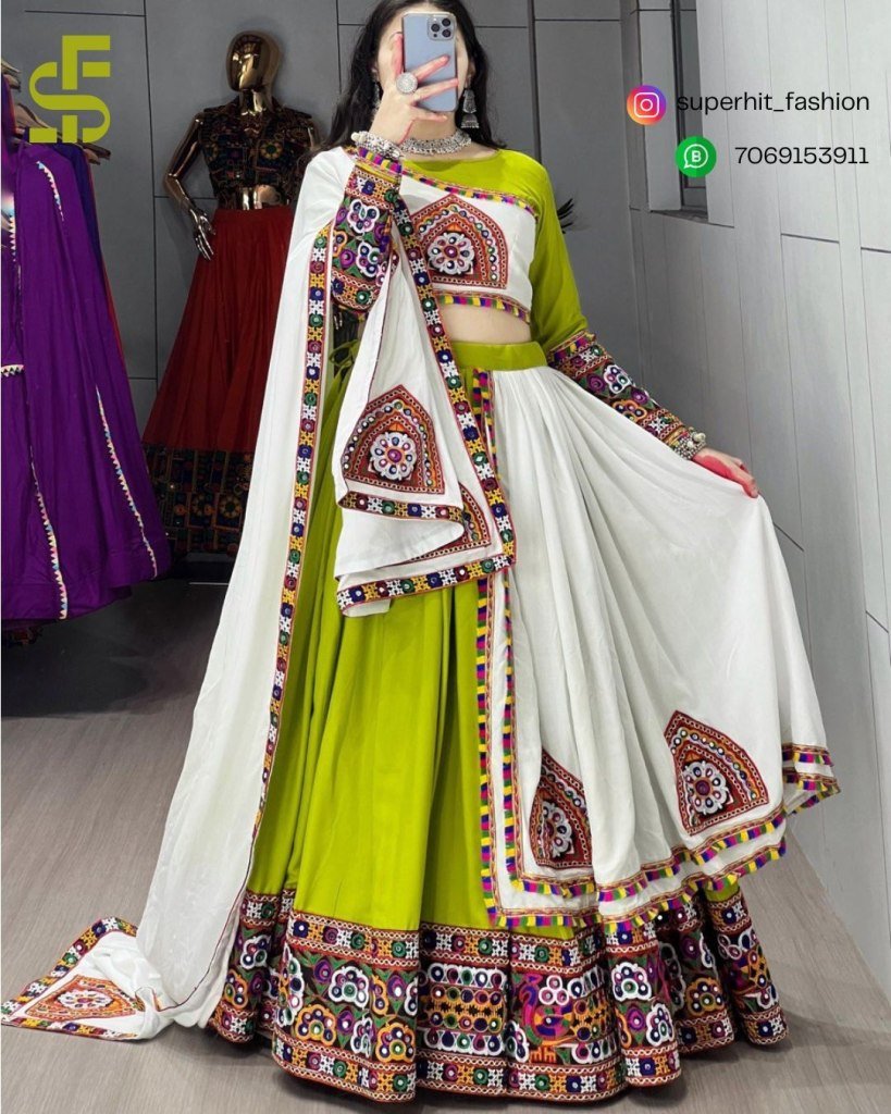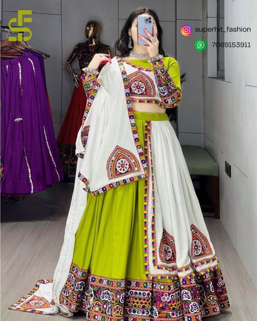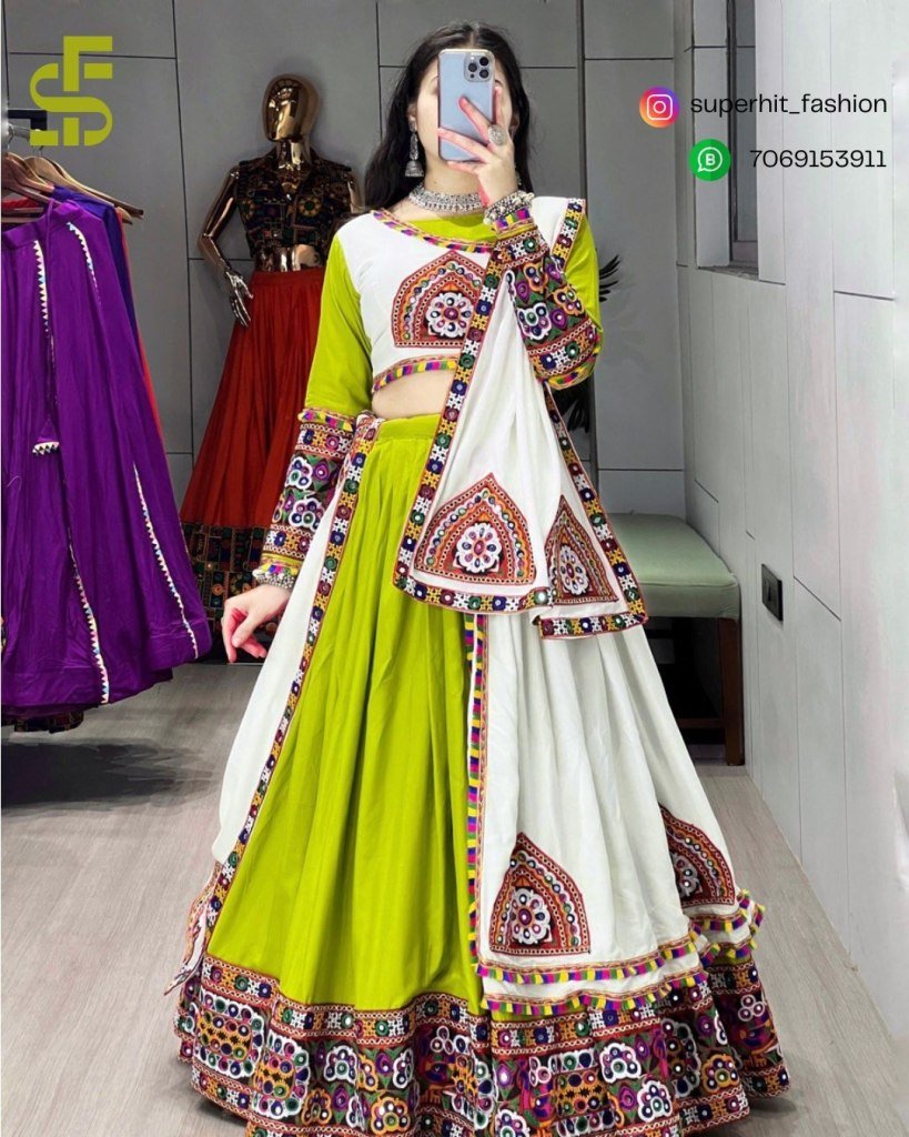 Navratri Collection Ethnic Women's Pure Rayon Cotton Lehenga Set Navratri Special, Gamthi And Real Mirror Work, Layered Patta, Four Border Patch Whole