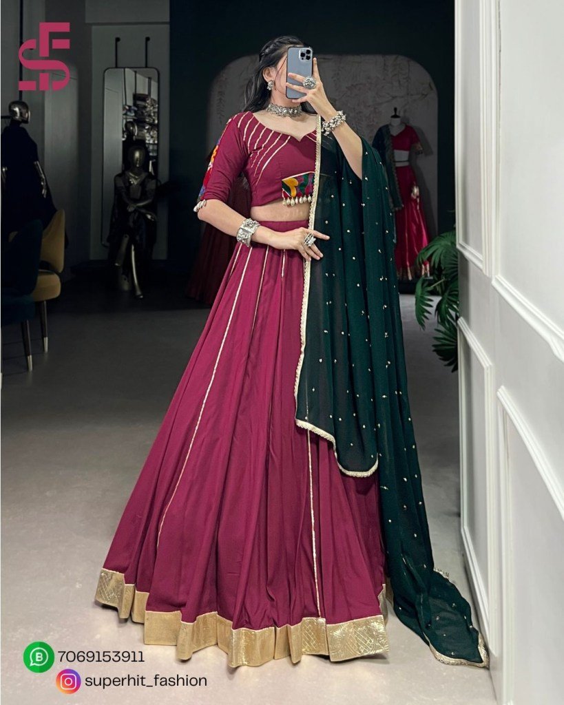 Navratri Lehenga Choli 1655 Wine Colour Designer Pure Rayon Lehenga Choli Set Gotta Patti Lace Mirror Gamthi Cowrie Accents And Embroidered