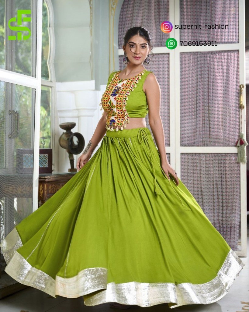 Navratri Radiance 1616 Parrot Colour Rayon Lehenga with Gamthi Work And Cowrie Lace Blouse Gotta Patti Rayon Lehenga And Gamthi Embroidered Blouse Se