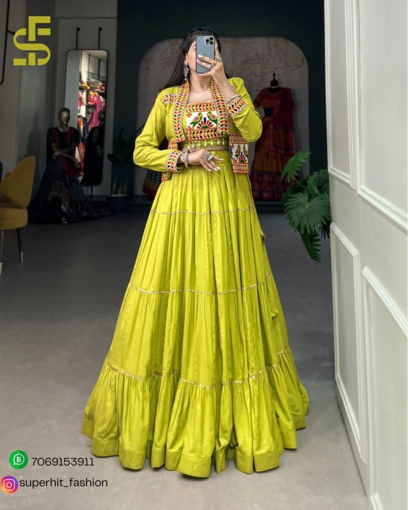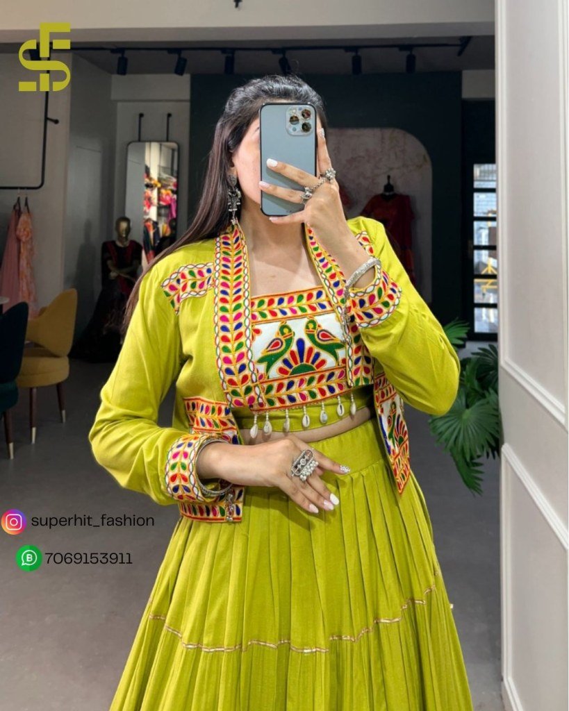 Elevate your Navratri look with this stunning 3-piece set—plain pure rayon lehenga, embroidered Gamthi work koti, and a matching blouse