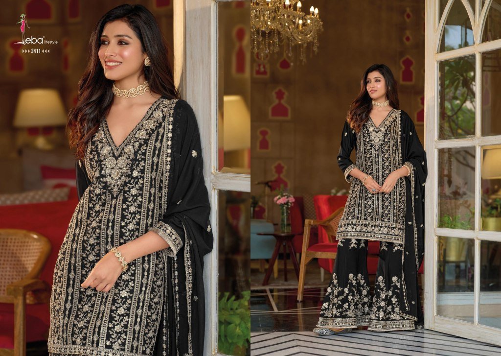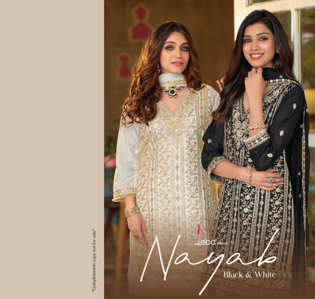 Luxurious and elegant, the Nayaab B/W Set is crafted in premium chinon fabric with intricate embroidery on top, plazo, and dupatta—perfect for festive and party wear.