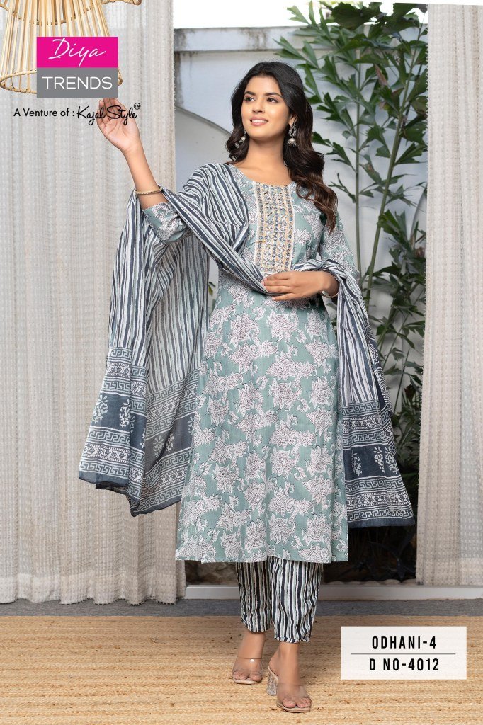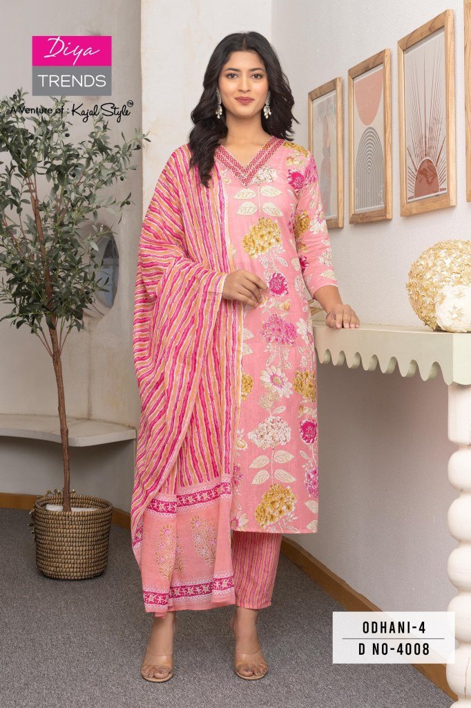 Stunning Odhani 4001 to 4016 by Diya Trends collection, featuring premium printed cotton kurtis paired with elegant pants and dupattas. Available at wholesale prices, perfect for casual and festive wear.