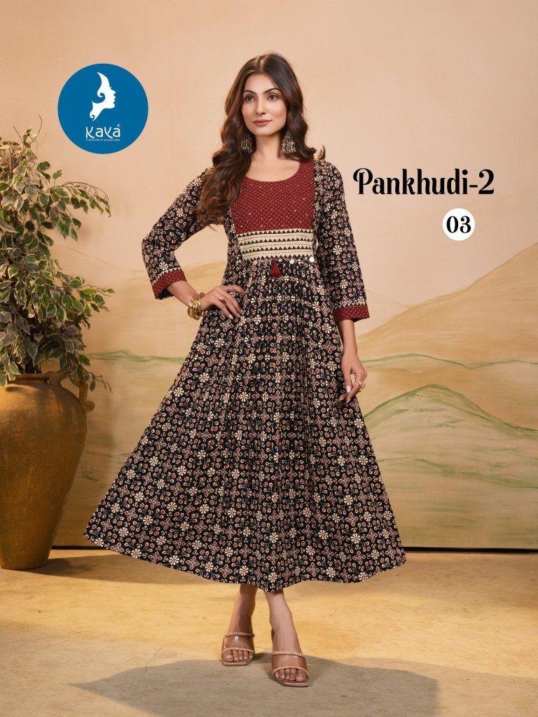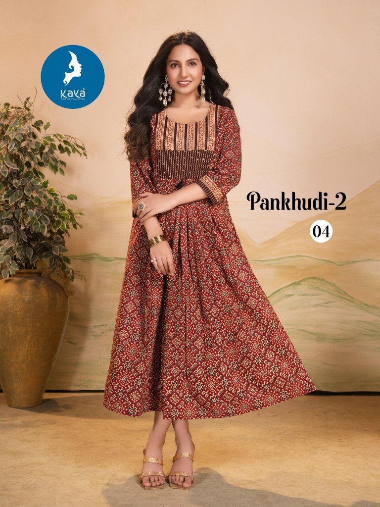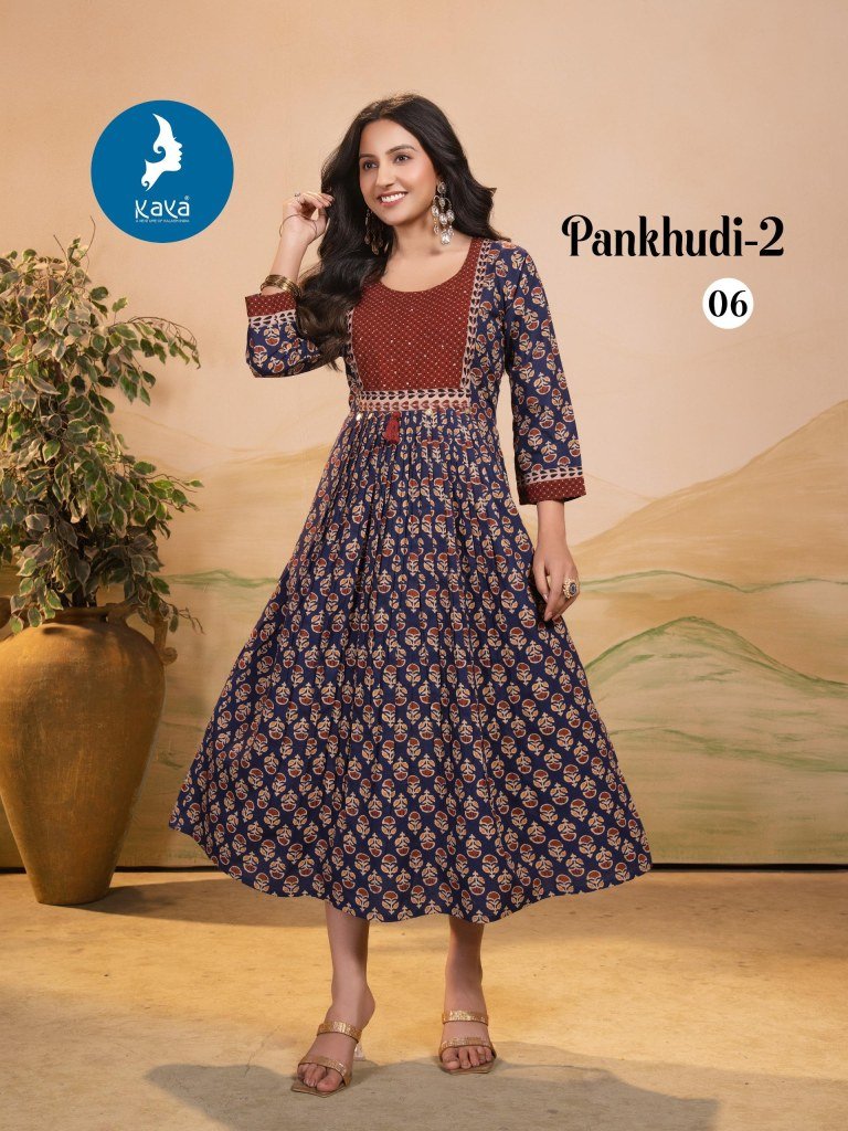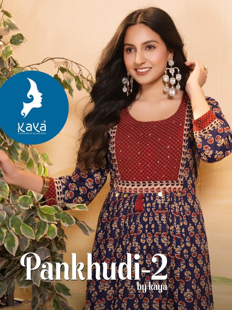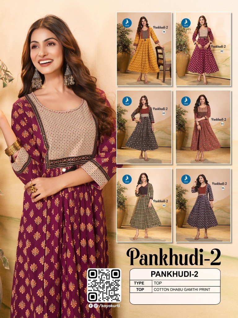 The Pankhudi 2 by Kaya catalogue featuring premium quality cotton Dhabu Gamthi printed long kurtis. Stylish ethnic wear at affordable prices. Shop now for comfort and tradition in one elegant outfit.