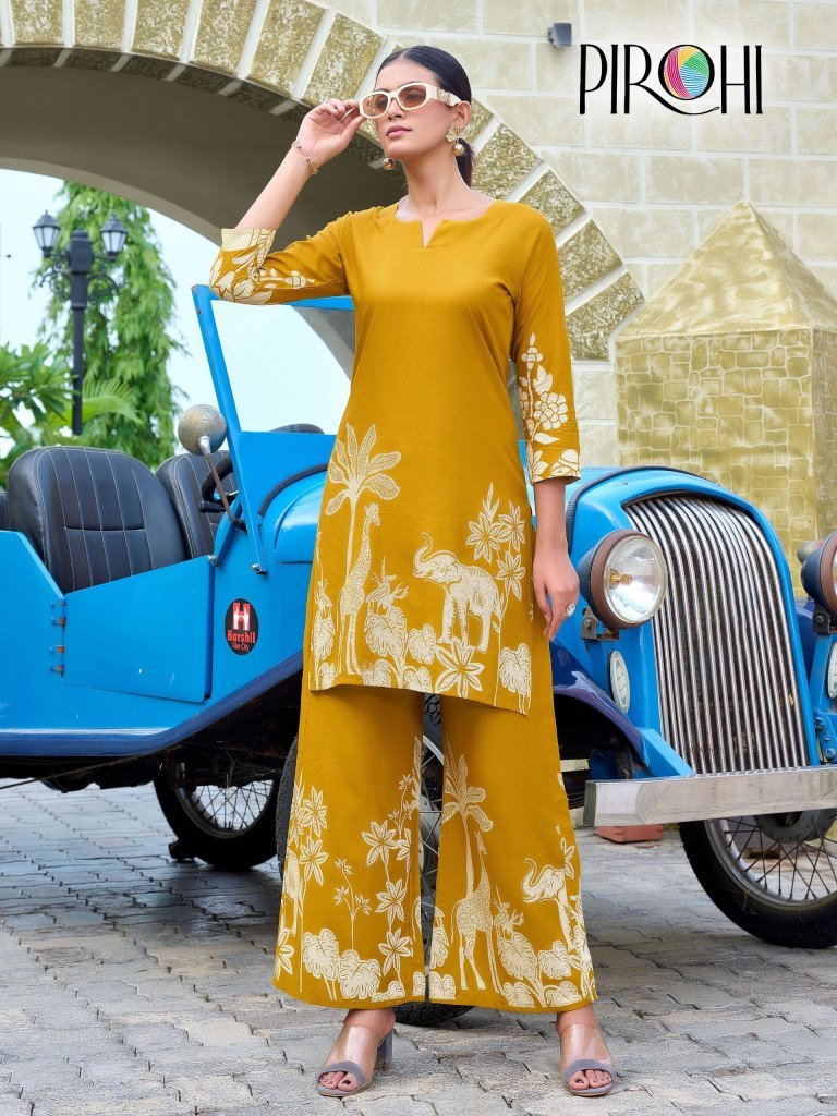 Pirohi Kit Kat Rayon Cord Set Featuring Mill Print and Palazzo Bottom Designed for Indian Hips Wholesale