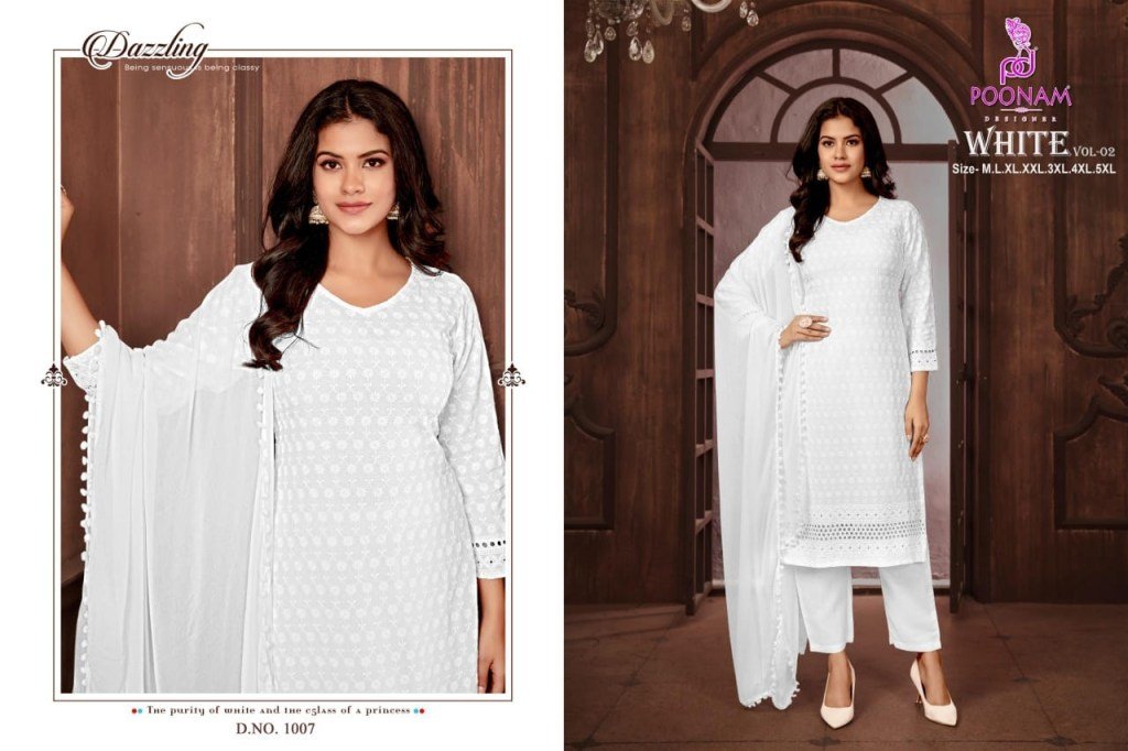 Poonam White Vol 2 Pure Rayon Chikankari Kurti Set with Heavy Rayon Pant And Nazneen Dupatta Wholesale