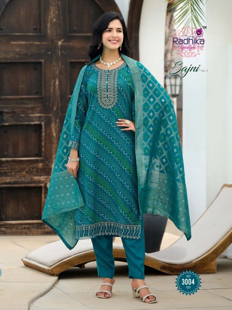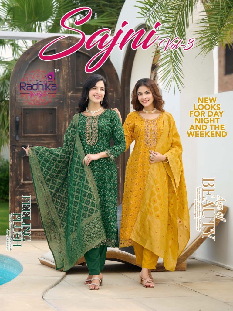 Radhika Life Style Sajni Vol 3 Rayon Print Kurti Pant Set with Banarasi Jacquard Dupatta And Embroidery Work Product And Wholesale