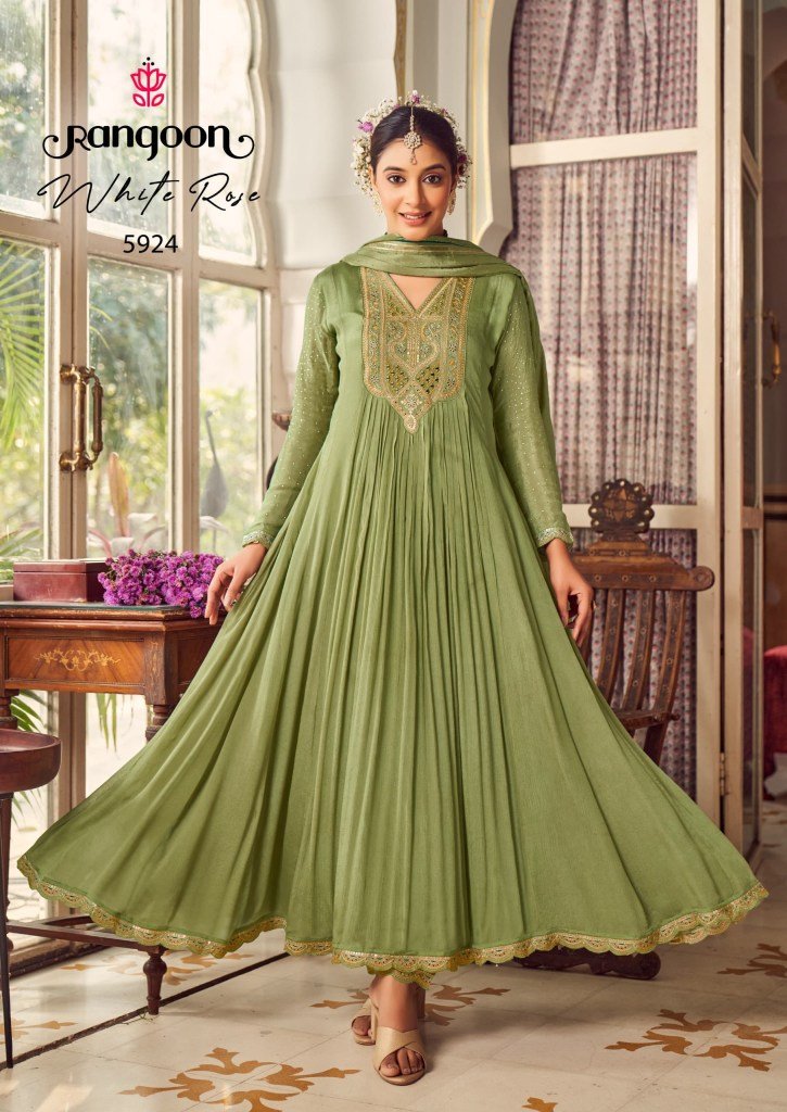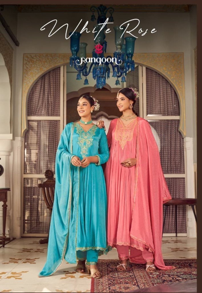 Rangoon Whiterose Chinon Fancy Neck And Sleeve Work Suit with Khatli Handwork Mirror and Cotton Inner Embellished Dupatta with Swarovski Diamond And F