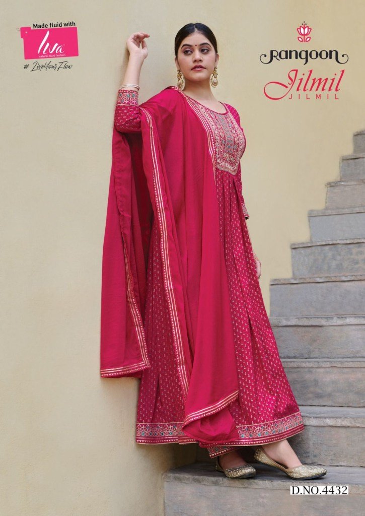 Rangoon presents jilmil rayon fancy work anarkali style ready made salwar suits wholesaler