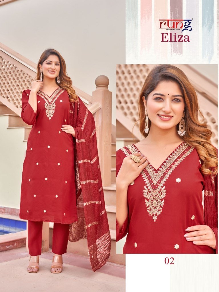 Rung by Eliza heavy roman silk embroidered readymade designer suit catalogue at low rate