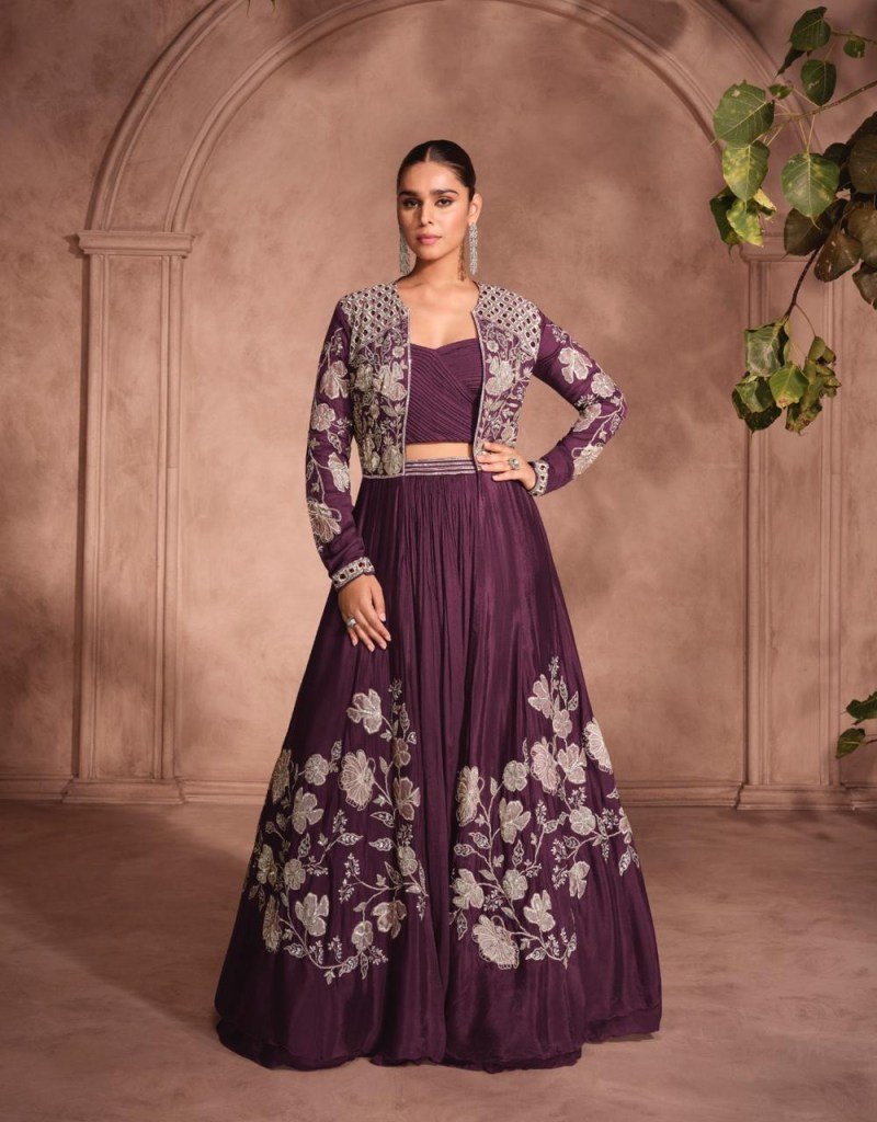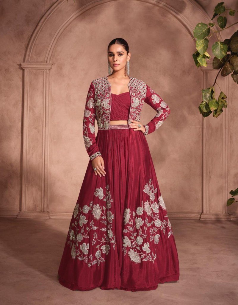 FABRIC-REAL PREMIUM CHINON SILK (FULL HEAVY LOOK FRONT AND BACK EMBROIDERED SHRUG WITH STYLIST BLOUSE AND LHENGHS WITH CANCAN)