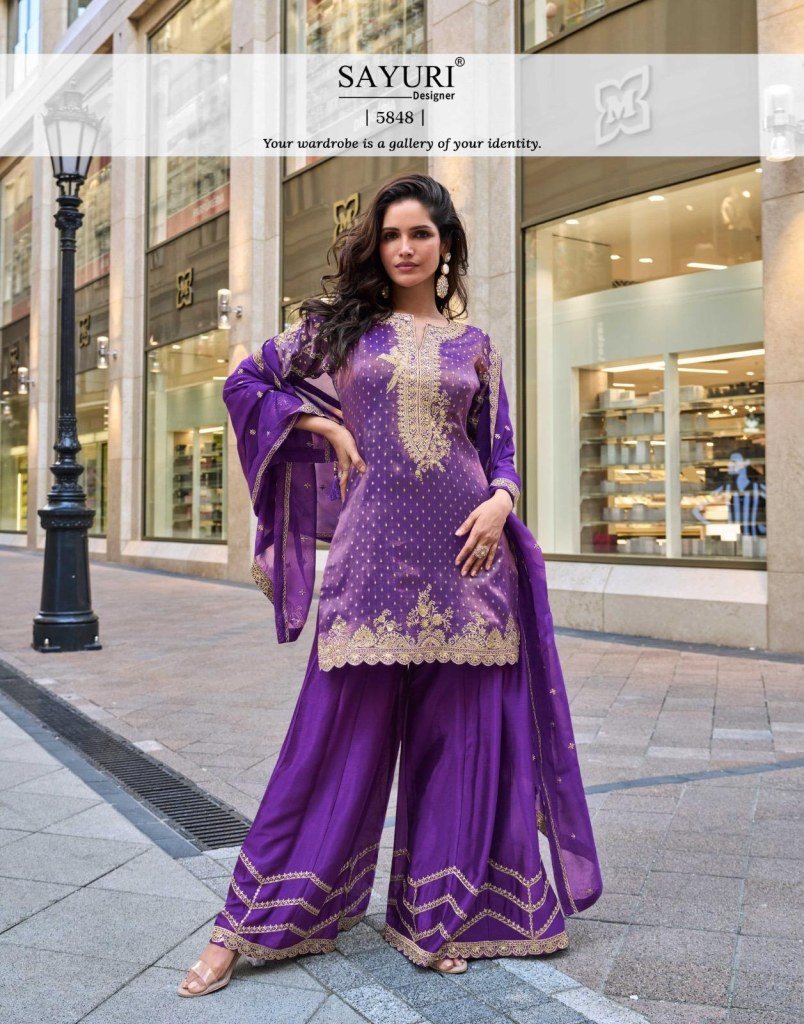 Sayuri Designer Swati Kurti Catalog Pure Viscos Simar Jacquard Silk Embroidered Top with Plazzo Sharara And Dupatta Wholesale
