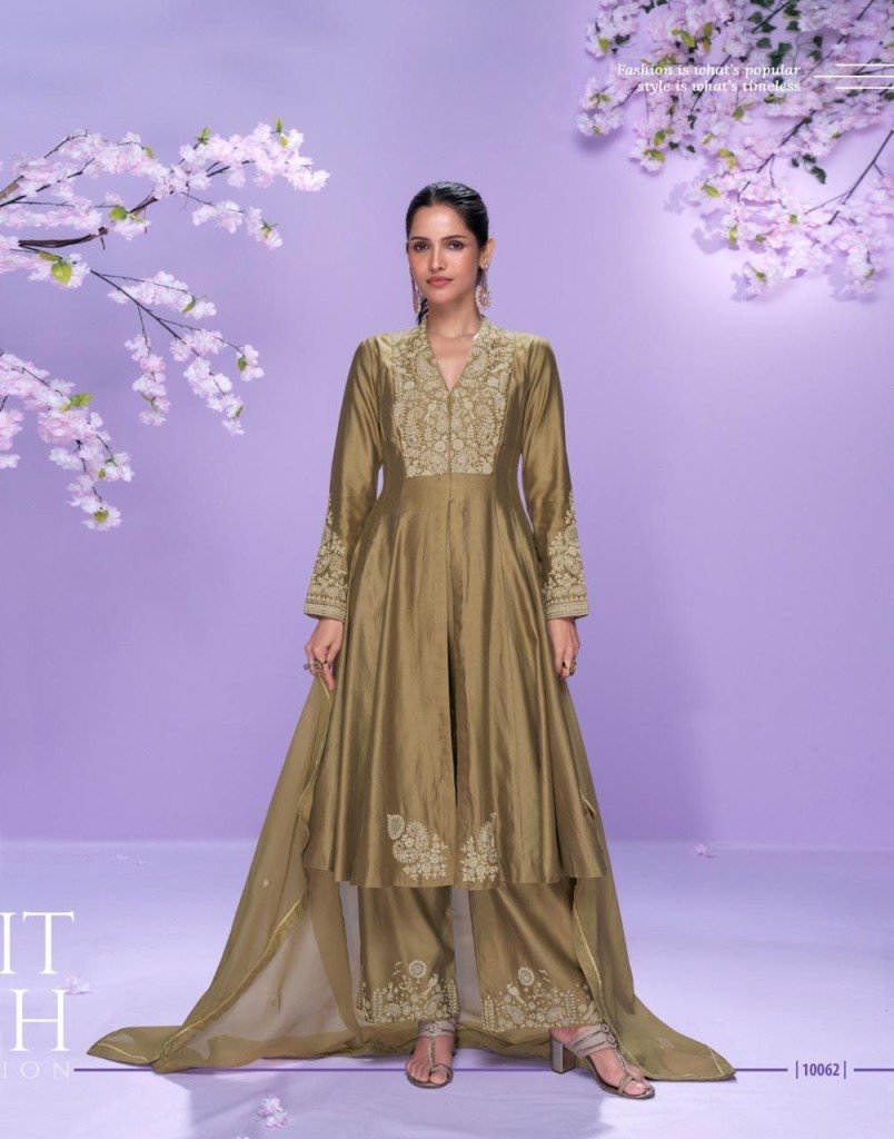 SKU : Sayuri Mausam Real Premium Roman Silk Embroidered Long Cut Top with Palazzo Pant And Organza Dupatta