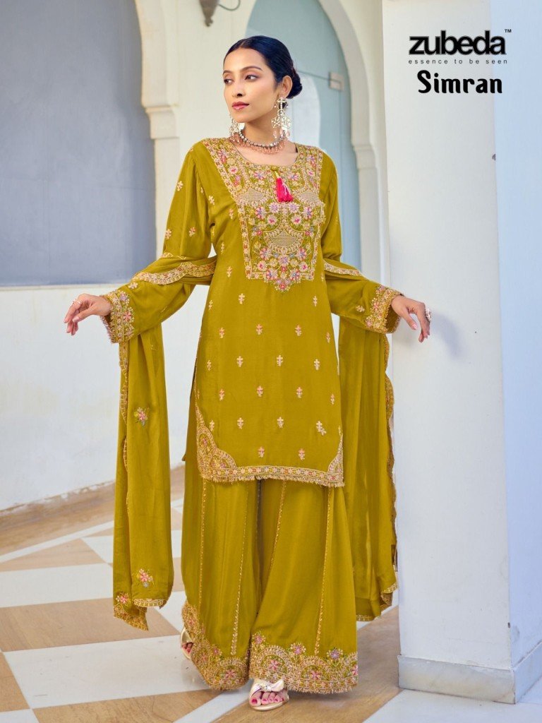 The "Simran" collection by Zubeda, featuring heavy designer hand-embroidered fancy sharara suits. These stunning suits are crafted with intricate detailing, perfect for festive and special occasions. Available at a low and affordable rate, this collection combines luxury with elegance for a captivating ethnic look.