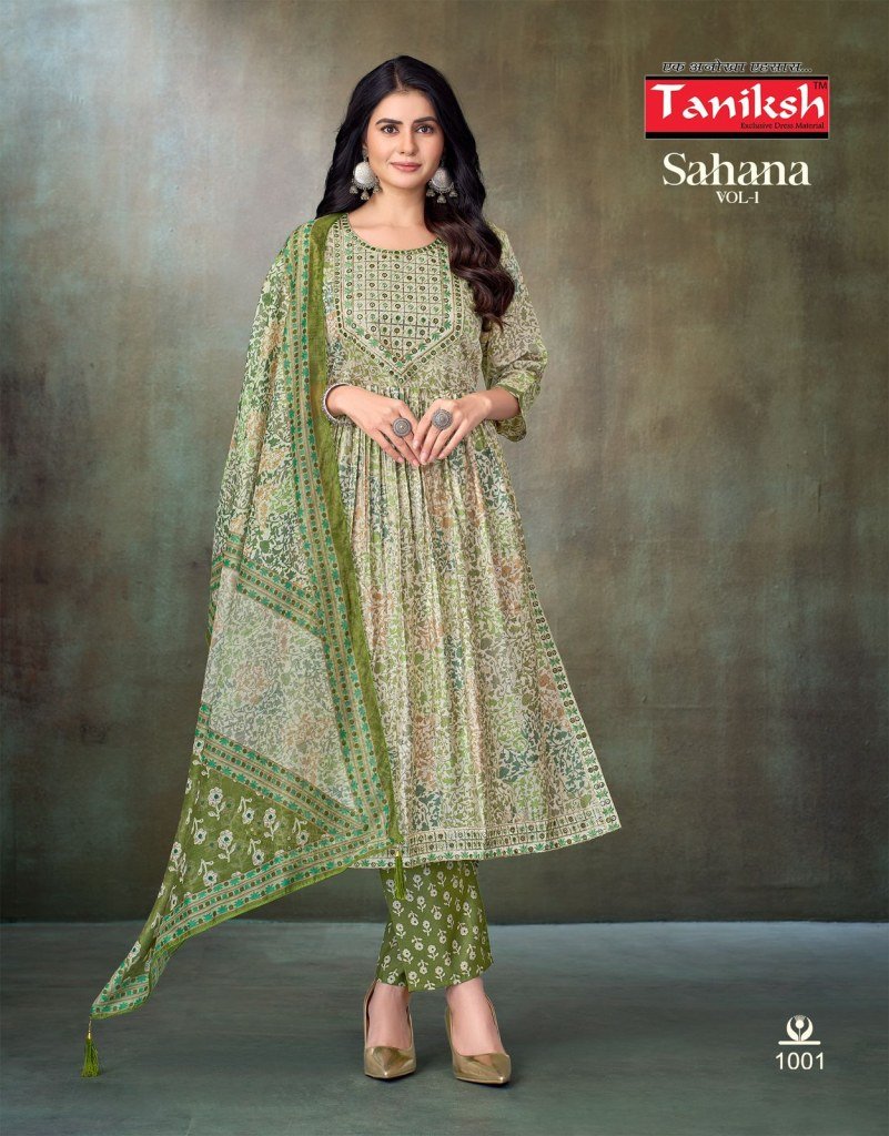 Taniksh Sahana Vol 1 Muslin Nyra Cut Kurti Set Readymade Suit with Embroidery And Digital Dupatta Wholesale