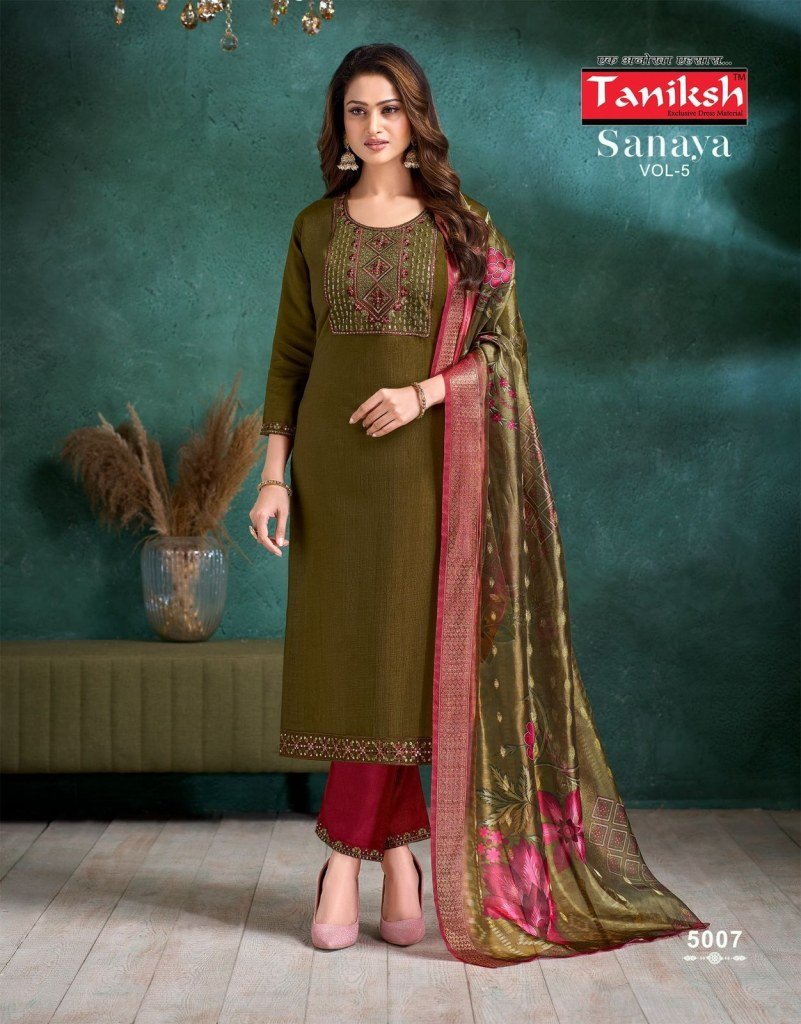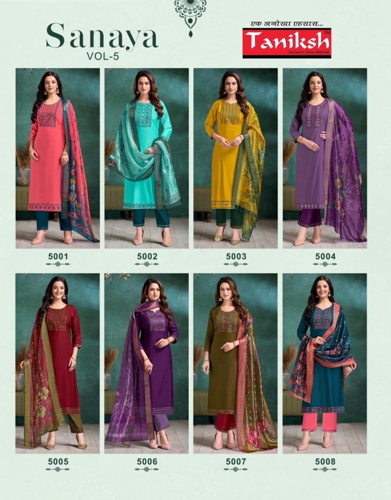 Taniksh Sanaya Vol 5 Designer Suit Vertical Embroidery Pocket Bottom And Digital Check Dupatta Wholesale