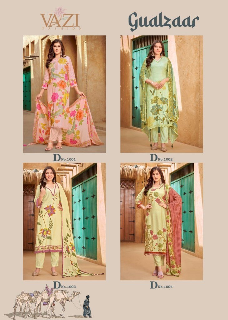 Vazi Fashion Gualzaar Viscose Muslin Suit Set with Handwork Aari Work And Thread Embroidery Accessories And Lace Bottom Fancy Dupatta Wholesale