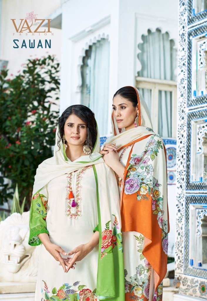 Vazi Fashion Sawan Designer Suit Pure Viscose Muslin Printed Top with Hand And Aari Work Embellished Bottom Pant and Printed Muslin Dupatta with Tas