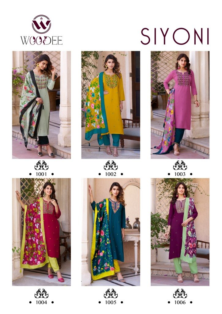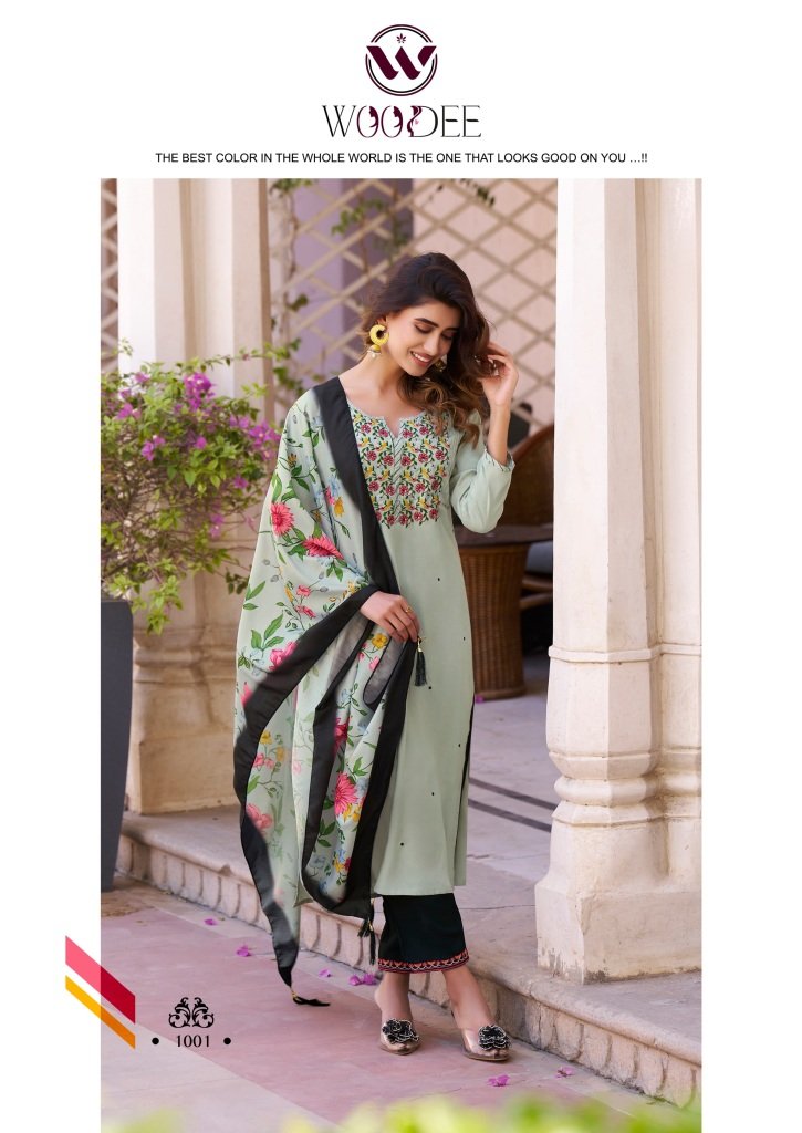 Woodee Siyoni Premium Rayon Kurti Palazzo Set with Muslin Digital Print Dupatta And Handwork Latkan Wholesale